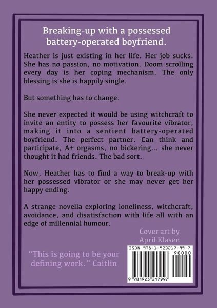 Breaking up with a possessed battery-operated boyfriend Heather is just existing in her life. Her job sucks. She has no passion, no motivation. Doom scrolling every day is her coping mechanism. The only good thing is she is happily single. But something needs to change. Needs to happen to her life. She never expected it would be using witchcraft to invite an entity to possess her favourite vibrator, making it into a sentient battery-operated boyfriend. The perfect partner. Can think and participate, A+ orgasms, no bickering...she never thought it had friends. The bad sort. Now, Heather has to find a way to break up with her possessed vibrator or she may never get her happy ending. A strange novella exploring loneliness, witchcraft, avoidance, and dissatisfaction with life all with an edge of millennial humour.