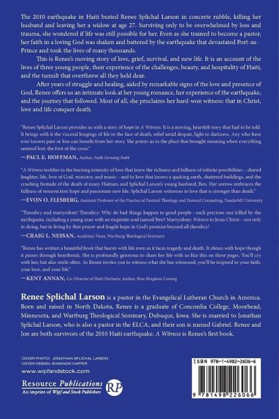 The 2010 earthquake in Haiti buried Renee Splichal Larson in concrete rubble, killing her husband and leaving her a widow at age 27. Surviving only to be overwhelmed by loss and trauma, she wondered if life was still possible for her. Even as she trained to become a pastor, her faith in a loving God was shaken and battered by the earthquake that devastated Port-au-Prince and took the lives of many thousands. This is Renee's moving story of love, grief, survival, and new life. It is an account of the lives of three young people, their experience of the challenges, beauty, and hospitality of Haiti, and the tumult that overthrew all they held dear. After years of struggle and healing, aided by remarkable signs of the love and presence of God, Renee offers us an intimate look at her young romance, her experience of the earthquake, and the journey that followed. Most of all, she proclaims her hard-won witness: that in Christ, love and life conquer death. ""Renee Splichal Larson provides us with a story of hope in A Witness. It is a moving, heartfelt story that had to be told. It brings with it the visceral longings of life in the face of death, relief amid despair, light in darkness. Any who have ever known pain or loss can benefit from her story. She points us to the place that brought meaning when everything seemed lost: the foot of the cross."" --Paul E. Hoffman, Author, Faith Forming Faith ""A Witness testifies to the burning intensity of love that knew the richness and fullness of infinite possibilities--shared laughter, life, love of God, ministry, and music--and to love that knows a quaking earth, shattered buildings, and the crushing finitude of the death of many Haitians and Splichal Larson's young husband, Ben. Her sorrow embraces the fullness of resurrection hope and passionate new life. Splichal Larson witnesses to love that is stronger than death."" --Evon O. Flesberg, Assistant Professor of the Practice of Pastoral Theology and Pastoral Counseling, Vanderbilt University ""Theodicy and martyrdom! Theodicy: Why do bad things happen to good people--each precious one killed by the earthquake, including a young man with an exquisite soul named Ben? Martyrdom: Witness to Jesus Christ--not only in dying, but in living by thin prayer and fragile hope in God's promise beyond all theodicy! --Craig L. Nessan, Academic Dean, Wartburg Theological Seminary ""Renee has written a beautiful book that bursts with life even as it faces tragedy and death. It shines with hope though it passes through heartbreak. She is profoundly generous to share her life with us like this on these pages. You'll cry with her, but also smile often. As Renee invites you to witness what she has witnessed, you'll be inspired in your faith, your love, and your life."" --Kent Annan, Co-Director of Haiti Partners; Author, Slow Kingdom Coming Renee Splichal Larson is a pastor in the Evangelical Lutheran Church in America. Born and raised in North Dakota, Renee is a graduate of Concordia College, Moorhead, Minnesota, and Wartburg Theological Seminary, Dubuque, Iowa. She is married to Jonathan Splichal Larson, who is also a pastor in the ELCA, and their son is named Gabriel. Renee and Jon are both survivors of the 2010 Haiti earthquake. A Witness is Renee's first book.