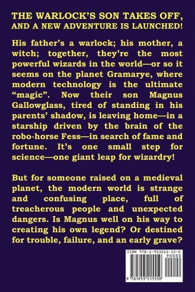 THE WARLOCK'S SON TAKES OFF, AND A NEW ADVENTURE IS LAUNCHED! His father's a warlock; his mother, a witch; together, they're the most powerful wizards in the world -- or so it seems on the planet Gramarye, where modern technology is the ultimate "magic." Now their son Magnus Gallowglass, tired of standing in his parents' shadow, is leaving home -- in a starship driven by the brain of the robo-horse Fess -- in search of fame and fortune. It's one small step for science - one giant leap for wizardry! But for someone raised on a medieval planet, the modern world is strange and confusing place, full of treacherous people and unexpected dangers. Is Magnus well on his way to creating his own legend? Or destined for trouble, failure, and an early grave?