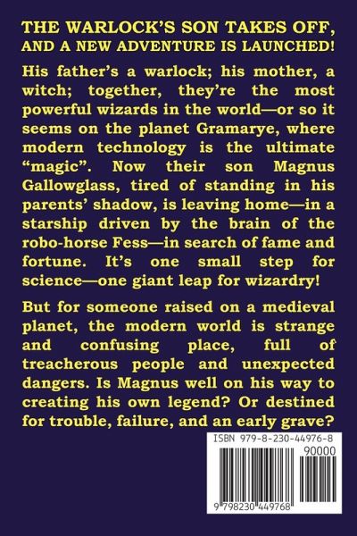 THE WARLOCK'S SON TAKES OFF, AND A NEW ADVENTURE IS LAUNCHED! His father's a warlock; his mother, a witch; together, they're the most powerful wizards in the world--or so it seems on the planet Gramarye, where modern technology is the ultimate "magic." Now their son Magnus Gallowglass, tired of standing in his parents' shadow, is leaving home - in a starship driven by the brain of the robo-horse Fess - in search of fame and fortune. It's one small step for science - one giant leap for wizardry! But for someone raised on a medieval planet, the modern world is strange and confusing place, full of treacherous people and unexpected dangers. Is Magnus well on his way to creating his own legend? Or destined for trouble, failure, and an early grave?