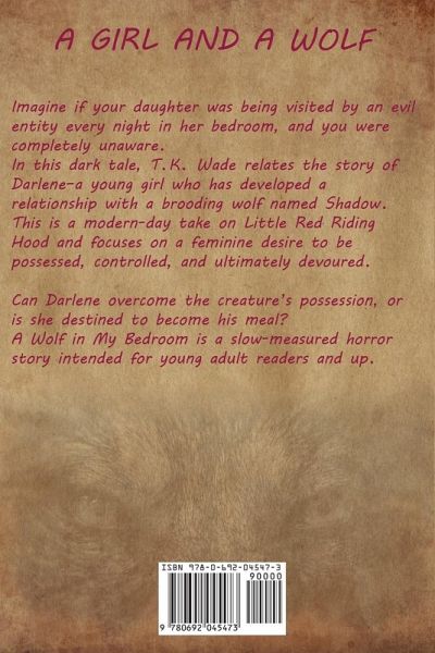 Imagine if your daughter was secretly being visited by an evil entity every night in her bedroom… and you were unawares. In this dark tale, T.K. Wade relates the story of Darlene-a young girl who has developed a relationship with a brooding wolf named Shadow. In many respects, this is a modern-day take on Little Red Riding-Hood and focuses on a feminine desire to be possessed, controlled, and ultimately devoured. Can Darlene ultimately overcome the creature's possession, or will she inevitably become his meal? "A Wolf in My Bedroom" is a slow-measured horror story intended for young adult readers and up.