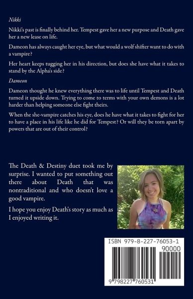 Nikki Nikki's past is finally behind her. Tempest gave her a new purpose and Death gave her a new lease on life. Dameon has always caught her eye, but what would a wolf shifter want to do with a vampire? Her heart keeps tugging her in his direction, but does she have what it takes to stand by the Alpha's side? Dameon Dameon thought he knew everything there was to life until Tempest and Death turned it upside down. Trying to come to terms with your own demons is a lot harder than helping someone else fight theirs. When the she-vampire catches his eye, does he have what it takes to fight for her to have a place in his life like he did for Tempest? Or will they be torn apart by powers that are out of their control?