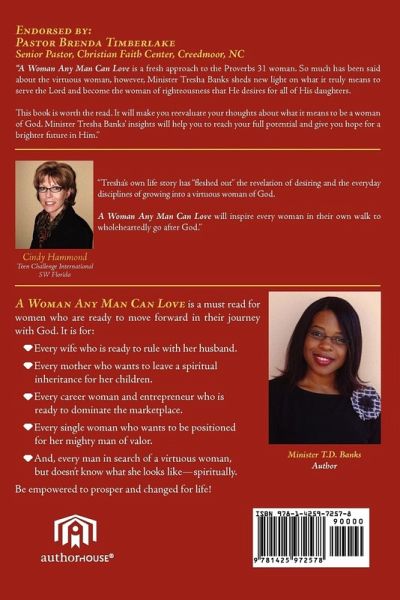 A Woman Any Man Can Love gives a contemporary perspective of the Proverbs 31 text, "The Virtuous Woman" and dispels myths that women have concerning what it means to be a virtuous woman. Being a woman any man can love goes beyond the exterior. As a matter of fact, being a woman any man can love has nothing to do with the clothes you wear, your hairstyle, the car you drive, your dress size or career path. You can be as beautiful as Halle Berry and as curvatious as Beyonce Knowles, but suffer a nervous breakdown at the slightest sign of adversity. You can be as rich and powerful as Oprah Winfrey, but lack good morals and integrity. Being a woman any man can love has nothing to do with money, sex, or power. Instead, she is a woman who commands God's ear, His favor and is clothed with strength and honor.