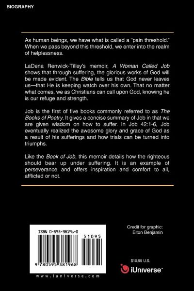 As human beings, we have what is called a "pain threshold." When we pass beyond this threshold, we enter into the realm of helplessness. LaDena Renwick-Tilley's memoir, oman Called Jobws that through suffering, the glorious works of God will be made evident. The Bible tells us that God never leaves us--that He is keeping watch over his own. That no matter what comes, we as Christians can call upon God, knowing he is our refuge and strength. Job is the first of five books commonly referred to as "The Books of Poetry." It gives a concise summary of Job in that we are given wisdom on how to suffer. In Job 42:1-6, Job eventually realized the awesome glory and grace of God as a result of his sufferings and how trials can be turned into triumphs. Like the Book of Job, this memoir details how the righteous should bear up under suffering. It is an example of perseverance and offers inspiration and comfort to all, afflicted or not.