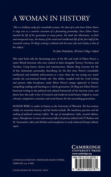 Eileen Power was the best-known medieval historian of the interwar years, and wrote one of the classic medieval histories, Medieval people. An active participant in the campaign for women's suffrage, she became one of the first writers and teachers of women's history. She made her career as lecturer and then as professor at the London School of Economics and, together with R. H. Tawney, turned a frontier subject, economic and social history, into a prominent part of the historical disciplines. She defined her subject as comparative and international in her passionate engagement with the forces of nationalism and militarism. Her major works on trade, merchants and comparative economic history were conveyed in writing that was individual and human, rich in narrative and ranging widely over time and place. In her evangelism for the subject on the lecture platform, on the radio, through the press and in the school book, she made her subject glamorous, and her history became compelling reading and listening for a whole generation. Yet when she died prematurely at the age of fifty-one, her legacy to history was lost, and now we have largely forgotten her and the passions that drove her to write history. By narrating the life story of this woman who combined scholarship with personality to make an academic career against the odds, Maxine Berg refocuses our attention on Eileen Power as one of the first and most remarkable 'women in history'.
