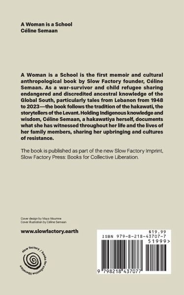 A Woman is a School is the first memoir and cultural anthropological book by Slow Factory founder, Céline Semaan. As a war-survivor and child refugee sharing endangered and discredited ancestral knowledge of the Global South, particularly tales from Lebanon from 1948 to 2023-the book follows the tradition of the hakawati, the storytellers of the Levant. Holding Indigenous knowledge and wisdom, Céline Semaan, a hakawati herself, documents what she has witnessed throughout her life and the lives of her family members, sharing her upbringing and cultures of resistance.