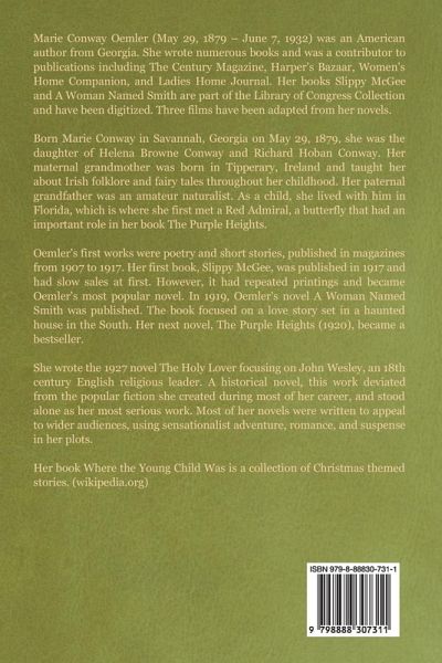 A Gothic story by Marie Conway Oemler. About the author: Marie Conway Oemler (May 29, 1879 - June 7, 1932) was an American author from Georgia. She wrote numerous books and was a contributor to publications including The Century Magazine, Harper's Bazaar, Women's Home Companion, and Ladies Home Journal. Her books Slippy McGee and A Woman Named Smith are part of the Library of Congress Collection and have been digitized. Three films have been adapted from her novels. Born Marie Conway in Savannah, Georgia on May 29, 1879, she was the daughter of Helena Browne Conway and Richard Hoban Conway. Her maternal grandmother was born in Tipperary, Ireland and taught her about Irish folklore and fairy tales throughout her childhood. Her paternal grandfather was an amateur naturalist. As a child, she lived with him in Florida, which is where she first met a Red Admiral, a butterfly that had an important role in her book The Purple Heights. Oemler's first works were poetry and short stories, published in magazines from 1907 to 1917. Her first book, Slippy McGee, was published in 1917 and had slow sales at first. However, it had repeated printings and became Oemler's most popular novel. In 1919, Oemler's novel A Woman Named Smith was published. The book focused on a love story set in a haunted house in the South. Her next novel, The Purple Heights (1920), became a bestseller. She wrote the 1927 novel The Holy Lover focusing on John Wesley, an 18th century English religious leader. A historical novel, this work deviated from the popular fiction she created during most of her career, and stood alone as her most serious work. Most of her novels were written to appeal to wider audiences, using sensationalist adventure, romance, and suspense in her plots. Her book Where the Young Child Was is a collection of Christmas themed stories. (wikipedia.org)