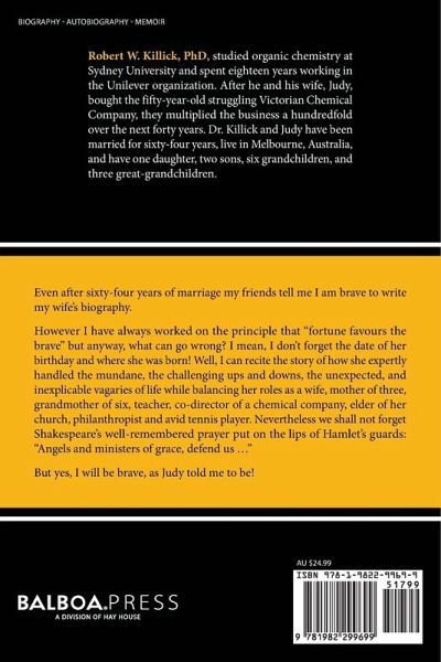 Even after sixty-four years of marriage my friends tell me I am brave to write my wife's biography. However I have always worked on the principle that "fortune favours the brave" but anyway, what can go wrong? I mean, I don't forget the date of her birthday and where she was born! Well, I can recite the story of how she expertly handled the mundane, the challenging ups and downs, the unexpected, and inexplicable vagaries of life while balancing her roles as a wife, mother of three, grandmother of six, teacher, co-director of a chemical company, elder of her church, philanthropist and avid tennis player. Nevertheless we shall not forget Shakespeare's well-remembered prayer put on the lips of Hamlet's guards: "Angels and ministers of grace, defend us ..." But yes, I will be brave, as Judy told me to be!