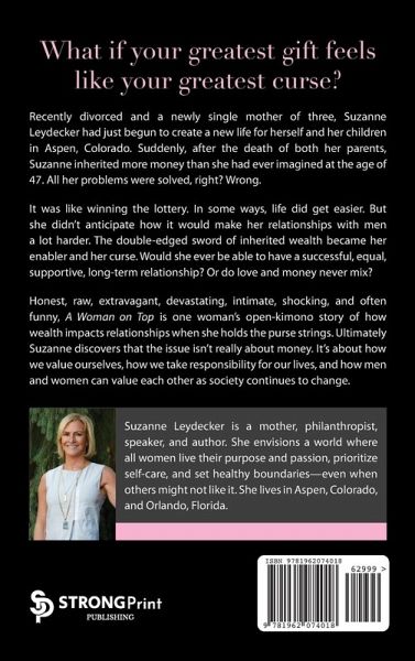 What if your greatest gift feels like your greatest curse? Recently divorced and a newly single mother of three, Suzanne Leydecker had just begun to create a new life for herself and her children in Aspen, Colorado. Suddenly, after the death of both her parents, Suzanne inherited more money than she had ever imagined at the age of 47. All her problems were solved, right? Wrong. It was like winning the lottery. In some ways, life did get easier. But she didn't anticipate how it would make her relationships with men a lot harder. The double-edged sword of inherited wealth became her enabler and her curse. Would she ever be able to have a successful, equal, supportive, long-term relationship? Or do love and money never mix? Honest, raw, extravagant, devastating, intimate, shocking, and often funny, A Woman on Top is one woman's open-kimono story of how wealth impacts relationships when she holds the purse strings. Ultimately Suzanne discovers that the issue isn't really about money. It's about how we value ourselves, how we take responsibility for our lives, and how men and women can value each other as society continues to change.