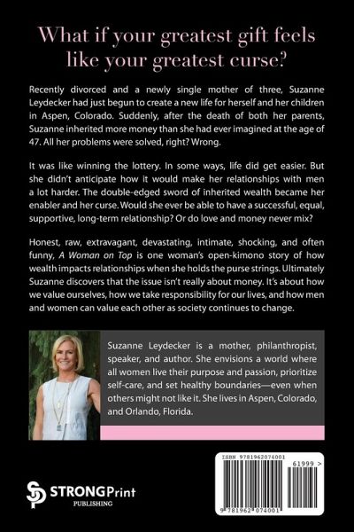 What if your greatest gift feels like your greatest curse? Recently divorced and a newly single mother of three, Suzanne Leydecker had just begun to create a new life for herself and her children in Aspen, Colorado. Suddenly, after the death of both her parents, Suzanne inherited more money than she had ever imagined at the age of 47. All her problems were solved, right? Wrong. It was like winning the lottery. In some ways, life did get easier. But she didn't anticipate how it would make her relationships with men a lot harder. The double-edged sword of inherited wealth became her enabler and her curse. Would she ever be able to have a successful, equal, supportive, long-term relationship? Or do love and money never mix? Honest, raw, extravagant, devastating, intimate, shocking, and often funny, A Woman on Top is one woman's open-kimono story of how wealth impacts relationships when she holds the purse strings. Ultimately Suzanne discovers that the issue isn't really about money. It's about how we value ourselves, how we take responsibility for our lives, and how men and women can value each other as society continues to change.