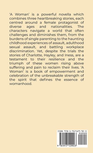 'A Woman' is a powerful novella which combines three heartbreaking stories, each centred around a female protagonist of diverse ages and nationalities. The characters navigate a world that often challenges and diminishes them, from the burdens of single parenting to the haunting childhood experiences of assault, adulthood sexual assault, and battling workplace discrimination. Yet, despite the trials the stories of Charlotte, Hayley, and Iness, are a testament to their resilience and the triumph of these women rising above suffering and pain to reclaim their lives. 'A Woman' is a book of empowerment and celebration of the unbreakable strength of the spirit that defines the essence of womanhood.