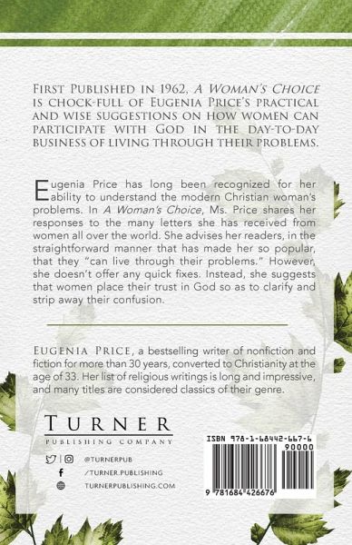 First Published in 1962, A Woman's Choice is chock-full of Eugenia Price's practical and wise suggestions on how women can participate with God in the day-to-day business of living through their problems. Eugenia Price has long been recognized for her ability to understand the modern Christian woman's problems. In A Woman's Choice, Ms. Price shares her responses to the many letters she has received from women all over the world. She advises her readers, in the straightforward manner that has made her so popular, that they "can live through their problems." However, she doesn't offer any quick fixes. Instead, she suggests that women place their trust in God so as to clarify and strip away their confusion. Updated with a new Preface, A Woman's Choice is the book of choice for today's independent Christian woman.