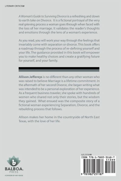 A Woman's Guide to Surviving Divorce is a refreshing and down to earth take on Divorce. It is a fictional portrayal of the very real grieving process a woman goes through when faced with the loss of her marriage. It validates the reader's thoughts and emotions through the lens of a woman's experience. As she reads, she will work her way through the feelings that invariably come with Separation or Divorce. This book then offers a roadmap to guide the reader through the process of re-defining herself and her life; empowering her to make healthy choices and create a gratifying future for herself and her family.