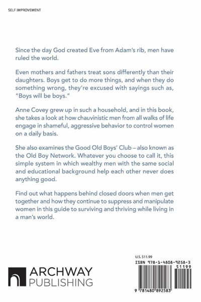 Since the day God created Eve from Adam's rib, men have ruled the world. Even mothers and fathers treat sons differently than their daughters. Boys get to do more things, and when they do something wrong, they're excused with sayings such as, "Boys will be boys." Anne Covey grew up in such a household, and in this book, she takes a look at how chauvinistic men from all walks of life engage in shameful, aggressive behavior to control women on a daily basis. She also examines the Good Old Boys' Club - also known as the Old Boy Network. Whatever you choose to call it, this simple system in which wealthy men with the same social and educational background help each other never does anything good. Find out what happens behind closed doors when men get together and how they continue to suppress and manipulate women in this guide to surviving and thriving while living in a man's world.