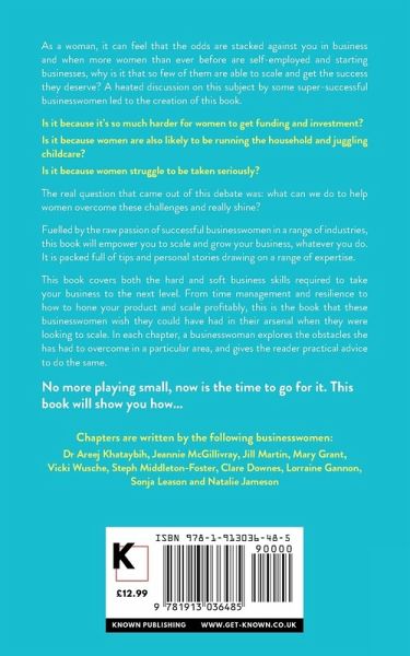 As a woman, it can feel that the odds are stacked against you in business and when more women than ever before are self-employed and starting businesses, why is it that so few of them are able to scale and get the success they deserve? A heated discussion on this subject by some super-successful businesswomen led to the creation of this book. Is it because it's so much harder for women to get funding and investment? Is it because women are also likely to be running the household and juggling childcare? Is it because women struggle to be taken seriously? The real question that came out of this debate was: what can we do to help women overcome these challenges and really shine? Fuelled by the raw passion of successful businesswomen in a range of industries, this book will empoweryou to scale and grow your business, whatever you do. It is packed full of tips and personal storiesdrawing on a range of expertise. This book covers both the hard and soft business skills required to take your business to the next level. From time management and resilience to how to hone your product and scale profitably, this is the book that these businesswomen wish they could have had in their arsenal when they were looking to scale. In each chapter, a businesswoman explores the obstacles she has had to overcome in a particular area, and gives the reader practical advice to do the same. No more playing small, now is the time to go for it. This book will show you how. Ten contributing authors including: Dr Areej Khataybih, Clare Downes, Jeannie McGillivray, Jill Martin, Lorraine Gannon, Mary Grant, Natalie Jameson, Sonja Leason, Steph Middleton-Foster and Vicki Wuche