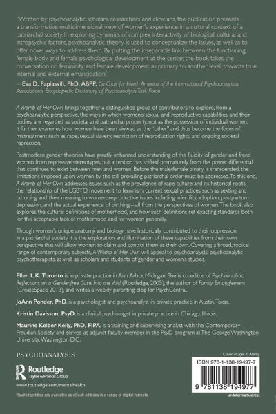 Gender and body-based distinctions continue to be a defining component of women's identities, both in psychoanalytic treatment and in life. Although females have made progress in many areas, their status within the human community has remained unstable and subject to societal whim. A Womb of Her Own brings together a distinguished group of contributors to explore, from a psychoanalytic perspective, the ways in which women's sexual and reproductive capabilities, and their bodies, are regarded as societal and patriarchal property, not as the possession of individual women. It further examines how women have been viewed as the "other" and thus become the focus of mistreatment such as rape, sexual slavery, restriction of reproduction rights, and ongoing societal repression. ¿ Postmodern gender theories have greatly enhanced understanding of the fluidity of gender and freed women from repressive stereotypes, but attention has shifted prematurely from the power differential that continues to exist between men and women. Before the male/female binary is transcended, the limitations imposed upon women by the still prevailing patriarchal order must be addressed. To this end, A Womb of Her Own addresses issues such as the prevalence of rape culture and its historical roots; the relationship of the LGBT movement to feminism; current sexual practices such as sexting and tattooing and their meaning to women; reproductive issues including infertility; adoption; postpartum depression and the actual experience of birthing-all from the perspectives of women. The book also explores the cultural definitions of motherhood, and how such definitions set exacting standards both for the acceptable face of motherhood and for women generally. While women's unique anatomy and biology have historically contributed to their oppression in a patriarchal society, it is the exploration and illumination of these capabilities from their own perspective that will allow women to claim and control them as their own. Covering a broad, topical range of contemporary subjects, A Womb of Her Own will appeal to psychoanalysts, psychoanalytic psychotherapists, as well as scholars and students of gender and women's studies.