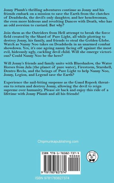 Jonny Plumb's thrilling adventures continue as Jonny and his friends embark on a mission to save the Earth from the clutches of Deadsheda, the devil's only daughter, and her henchwoman, the even more hideous and revolting Dances with Death, who has an odd aversion to custard. But why? Join them as the Outriders from Hell attempt to break the force field created by the Shard of Pure Light, all while plotting to destroy Jonny, his family, and friends to steal the Golden Globe. Watch as Nanny Noo takes on Deadsheda in an unarmed combat showdown. Yes, it's one ageing nanny facing off against the most evil, hideously ugly, cackling devil child. Will she emerge victorious? Could Nanny Noo be the hero? Will Jonny's friends and family unite with Blueshadow, the Water Horses from Jala (the planet of pure water), Firestorm, Starshell, Dentro Reclu, and the beings of Pure Light to help Nanny Noo, Jonny, Legion, and Legend save the Earth? Experience the nail-biting suspense as the Gnud Repeek threatens to return and destroy Jonny, allowing the devil to reign supreme over humanity. Please sit back and enjoy this ride of a lifetime with Jonny Plumb and all his friends!