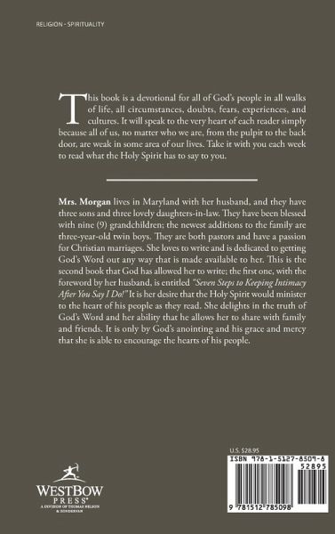 This book is a devotional for all of God’s people in all walks of life, all circumstances, doubts, fears, experiences, and cultures. It will speak to the very heart of each reader simply because all of us, no matter who we are, from the pulpit to the back door, are weak in some area of our lives. Take it with you each week to read what the Holy Spirit has to say to you.