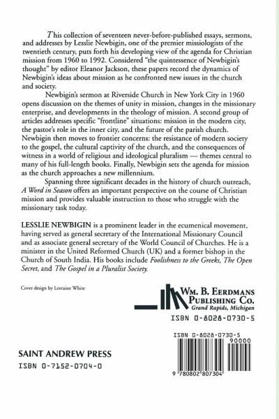 Books & Culture "Many fresh and stimulating insights to the world Christian missionary enterprise." International Bulletin of Missionary Research "Here is vintage Newbigin, a treat for those of us who over the years have been inspired and challenged, time and again, by his lucid defense of the Christian missionary task both abroad (mainly India) and at home (mainly the United Kingdom). . . If you have read some of Newbigin's writings in the past, here is a chance to refresh their memory with a synthesis of his thought. For the newcomer to Newbigin, A World in Season is a treat that should not be missed." Lutheran Quarterly "A stimulating introduction to the thought world of an ecumenical giant of the twentieth century who, though past eighty-five and severely handicapped in sight, is nevertheless constantly producing fresh perspectives on the church, kingdom, and mission." Missiology "A helpful and thought-provoking book for every missionary and every mission administrator."