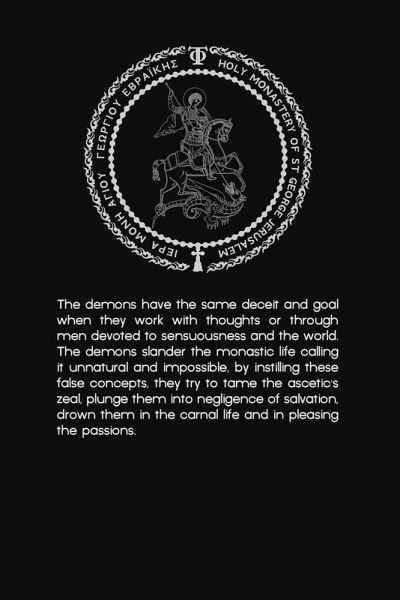 "The demons have the same deceit and goal when they work with thoughts or through men devoted to sensuousness and the world. The demons slander the monastic life calling it unnatural and impossible, by instilling these false concepts, they try to tame the ascetic's zeal, plunge them into negligence of salvation, drown them in the carnal life and in pleasing the passions."