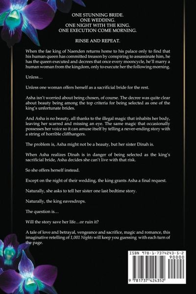 One stunning bride. One wedding. One night with the king. One execution come morning. Rinse and repeat. When the fae king of Naenden returns home to his palace only to find that his human queen has committed treason by conspiring to assassinate him, he has the queen executed and decrees that once every mooncycle, he'll marry a human woman from the kingdom, only to execute her the following morning. Unless... Unless one woman offers herself as a sacrificial bride for the rest. Asha isn't worried about being chosen, of course. The decree was quite clear about beauty being among the top criteria for being selected as one of the king's unfortunate brides. And Asha is no beauty, all thanks to the illegal magic that inhabits her body, leaving her scarred and missing an eye. The same magic that occasionally possesses her voice so it can amuse itself by telling a never-ending story with a string of horrible cliffhangers. The problem is, Asha might not be a beauty, but her sister Dinah is. When Asha realizes Dinah is in danger of being selected as the king's sacrificial bride, Asha decides she can't live with that risk. So she offers herself instead. Except on the night of their wedding, the king grants Asha a final request. Naturally, she asks to tell her sister one last bedtime story. Naturally, the king eavesdrops. The question is... Will the story save her life...or ruin it? A tale of love and betrayal, vengeance and sacrifice, magic and romance, this imaginative retelling of 1,001 Nights will keep you guessing with each turn of the page.