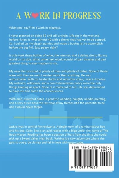 What can I say? I'm a work in progress. I never planned on being 39 and still a virgin. Life got in the way and before I knew it I was almost 40 with a cherry that had yet to be popped. So, I pulled up my big girl panties and made a bucket list to accomplish before the big 4-0. Easy peasy, right? It only took three bottles of wine, the internet, and a dating site to flip my world on its side. What came next would consist of part disaster and part greatest thing to ever happen to me. My new life consisted of plenty of men and plenty of dates. None of those were with the one man I wanted more than anything. He was untouchable. With his heated looks and seductive voice, I was in trouble. My restraint, willpower, and a non-fraternization policy were the only things keeping us apart. None of it mattered to him. He was determined to have me and damn the consequences. With men, awkward dates, a geriatric wedding, naughty needle-pointing, and a sexy as sin boss the last year of my thirties had the potential to be one I would never forget.
