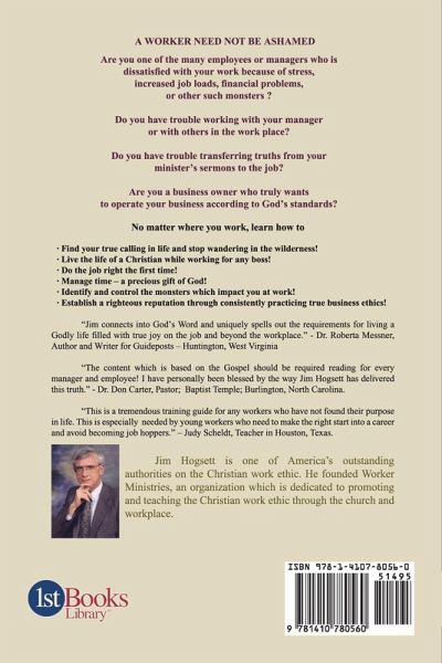 TAKE THIS JOB AND SHOVE IT ? ? Millions of Americans have become dissatisfied with work. It has become a dirty four-letter word. This is a sad fact especially since most of us spend one third of our life at work. The good news is you do not have to live in a hell called work! In his book, A Worker Need Not Be Ashamed, Jim Hogsett will show you how to · Find your calling in life and stop wandering in the wilderness! · Prepare yourself for your mission. · Live the life of a Christian while working for any boss! · Do the job right the first time! · Manage your time - a major gift from God. · Establish a good reputation through consistently practicing true business ethics! ARE THERE MONSTERS IN YOUR LIFE WHICH IMPACT YOUR LIFE WHILE AT WORK? God never promised that life would be easy. Life is not a bowl of cherries! Jim Hogsett provides valuable instruction on how to deal with common enemies