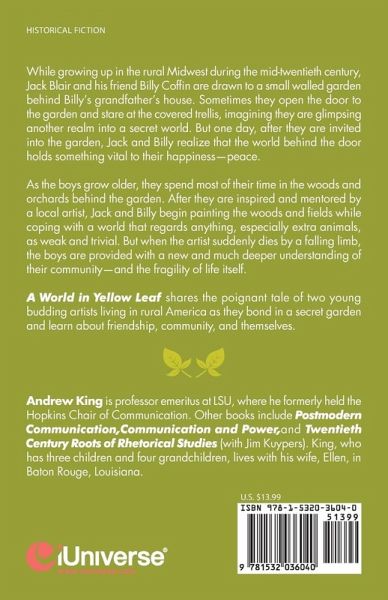 While growing up in the rural Midwest during the mid-twentieth century, Jack Blair and his friend Billy Coffin are drawn to a small walled garden behind Billys grandfathers house. Sometimes they open the door to the garden and stare at the covered trellis, imagining they are glimpsing another realm into a secret world. But one day, after they are invited into the garden, Jack and Billy realize that the world behind the door holds something vital to their happinesspeace. As the boys grow older, they spend most of their time in the woods and orchards behind the garden. After they are inspired and mentored by a local artist, Jack and Billy begin painting the woods and fields while coping with a world that regards anything, especially extra animals, as weak and trivial. But when the artist suddenly dies by a falling limb, the boys are provided with a new and much deeper understanding of their communityand the fragility of life itself. A World in Yellow Leaf shares the poignant tale of two young budding artists living in rural America as they bond in a secret garden and learn about friendship, community, and themselves.