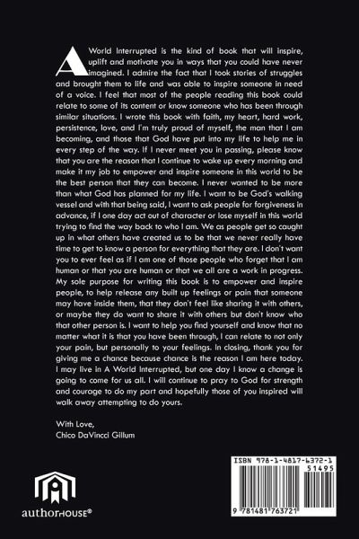 A World Interrupted is the kind of book that will inspire, uplift and motivate you in ways that you could have never imagined. I admire the fact that I took stories of struggles and brought them to life and was able to inspire someone in need of a voice. I feel that most of the people reading this book could relate to some of its content or know someone who has been through similar situations. I wrote this book with faith, my heart, hard work, persistence, love, and I'm truly proud of myself, the man that I am becoming, and those that God have put into my life to help me in every step of the way. If I never meet you in passing, please know that you are the reason that I continue to wake up every morning and make it my job to empower and inspire someone in this world to be the best person that they can become. I never wanted to be more than what God has planned for my life. I want to be God's walking vessel and with that being said, I want to ask people for forgiveness in advance, if I one day act out of character or lose myself in this world trying to find the way back to who I am. We as people get so caught up in what others have created us to be that we never really have time to get to know a person for everything that they are. I don't want you to ever feel as if I am one of those people who forget that I am human or that you are human or that we all are a work in progress. My sole purpose for writing this book is to empower and inspire people, to help release any built up feelings or pain that someone may have inside them, that they don't feel like sharing it with others, or maybe they do want to share it with others but don't know who that other person is. I want to help you find yourself and know that no matter what it is that you have been through, I can relate to not only your pain, but personally to your feelings. In closing, thank you for giving me a chance because chance is the reason I am here today. I may live in A World Interrupted, but one day I know a change is going to come for us all. I will continue to pray to God for strength and courage to do my part and hopefully those of you inspired will walk away attempting to do yours. With Love, Chico DaVincci Gillum