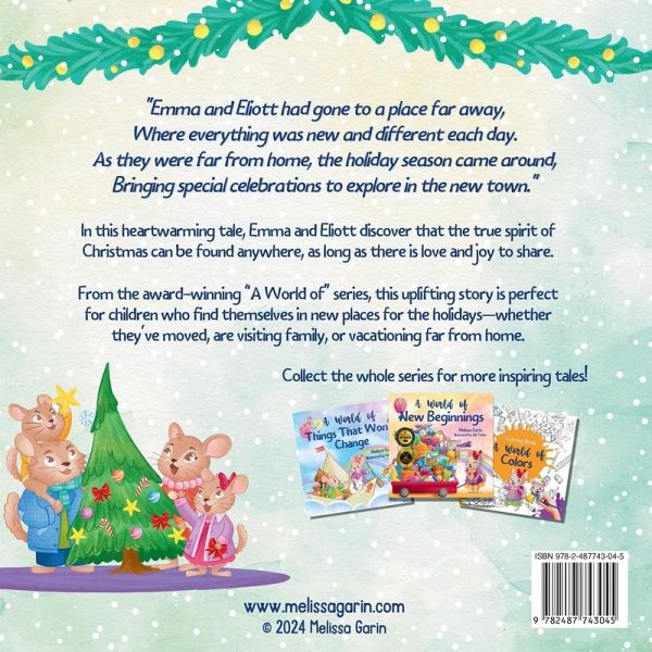 ★ From the award-winning and bestselling "A World of" series, this heartwarming story is a must-read for families spending the holidays away from home! ★ Join Emma and Eliott on a magical holiday adventure as they discover the joy and wonder of Christmas in a new town. Together, they explore festive activities like lantern-making, dancing, and more, uncovering that the true spirit of Christmas lies in love, togetherness, and the memories we create-wherever we may go. Why parents and kids love this book: 1. * Comforts children spending Christmas in new surroundings. * Encourages kids to embrace new experiences with curiosity and wonder. * Practical and relatable for families navigating moves, travel, or visiting loved ones during the holidays. * Beautifully illustrated pages bring Emma and Eliott's adventures to life. ★ A delightful blend of storytelling and life lessons, this book is perfect for sparking family conversations about change and togetherness. ★ Download FREE coloring pages featuring Emma and Eliott on the author's website! ★ Grab your copy today and add this timeless tale to your family's bookshelf!