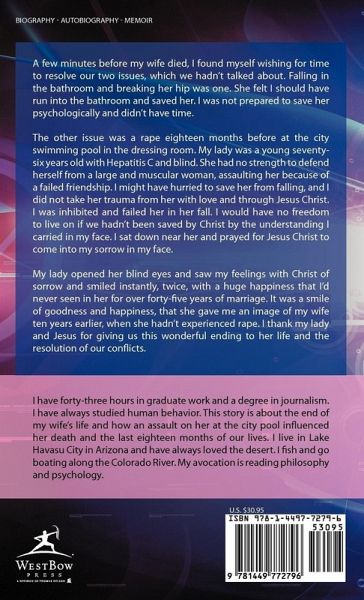 A few minutes before my wife died, I found myself wishing for time to resolve our two issues, which we hadn't talked about. Falling in the bathroom and breaking her hip was one. She felt I should have run into the bathroom and saved her. I was not prepared to save her psychologically and didn't have time. The other issue was a rape eighteen months before at the city swimming pool in the dressing room. My lady was a young seventy-six years old with Hepatitis C and blind. She had no strength to defend herself from a large and muscular woman, assaulting her because of a failed friendship. I might have hurried to save her from falling, and I did not take her trauma from her with love and through Jesus Christ. I was inhibited and failed her in her fall. I would have no freedom to live on if we hadn't been saved by Christ by the understanding I carried in my face. I sat down near her and prayed for Jesus Christ to come into my sorrow in my face. My lady opened her blind eyes and saw my feelings with Christ of sorrow and smiled instantly, twice, with a huge happiness that I'd never seen in her for over forty-five years of marriage. It was a smile of goodness and happiness, that she gave me an image of my wife ten years earlier, when she hadn't experienced rape. I thank my lady and Jesus for giving us this wonderful ending to her life and the resolution of our conflicts.