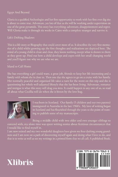 Egypt And Beyond Gloria is a qualified Archeologist and her first opportunity to work with her first ever dig site is about to come true. Adventure, yes lots of that as she will be working under supervision on one of the great pyramids. This story has everything: adventure, disappointment and regret. Will Gloria make it through six weeks in Cairo with a complete stranger and survive it. Life's Drifting Shadows This is a life story or Biography that could cover most of us. It describes the very first memories of a child whilst growing up; the first thoughts and realizations are depicted here. The mind of a young child is clean and clear, they know nothing except what is shown to them as they grow up. Find out how a child develops and copes with her small changing world and you'll figure out why we are who we are. . Island to Call Home She has everything a girl could want, a great job, friends to keep her life interesting and a family with whom she is close to. Then one day she agrees to go on a cruise with her family. Her normally peaceful and organized life takes a turn for the worst on this trip and she is questioning her whole well-adjusted lifestyle that she has been living. Adventure, romance and intrigue is what this story will drag you into. It could happen to any one of us, so read all about what Cecillia will do when she is bitten by the love bug.