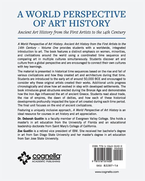 A World Perspective of Art History: Ancient Art History from the First Artists to the 14th Century - Volume One provides students with a worldwide, integrated introduction to art. The book features a distinct emphasis on women, minorities, and civilizations around the world using a coordinated time sequence and comparing art in multiple cultures simultaneously. Students discover art and culture from a global perspective and are encouraged to connect their own cultures with key learnings. The material is presented in historical time sequences based on the rise and fall of various civilizations and how they created art and architecture during that time. Students are introduced to the early art of around 50,000 BCE and encouraged to consider why these original artists created their works. Additional units progress chronologically and show how art evolved in step with developed settlements. The book introduces great structures erected during the Bronze Age and demonstrates how the Iron Age influenced the art of ancient Greece. Students read about trade, the rise of empires, the dawn of deities, and how each of these historical developments profoundly impacted the type of art created during each time period. The final unit focuses on the end of ancient civilizations. Featuring a uniquely inclusive approach, A World Perspective of Art History is an ideal resource for courses in art history and art appreciation. Dr. Deborah Gustlin is a faculty member of Evergreen Valley College. She holds a master's in art education from the University of Florida and an educational leadership doctorate from Saint Mary's College of California. Zoe Gustlin is a retired vice president of IBM. She received her bachelor's degree in art from San Diego State University and her master's degree in art education from San Jose State University.