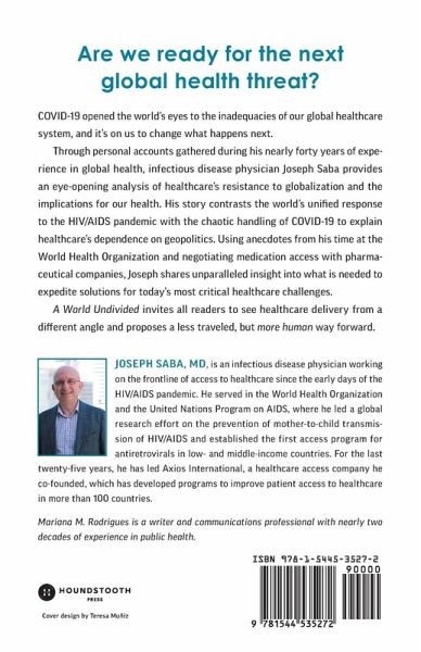 Are we ready for the next global health threat? COVID-19 opened the world's eyes to the inadequacies of our global healthcare system, and it's on us to change what happens next. Through personal accounts gathered during his nearly forty years of experience in global health, infectious disease physician Joseph Saba provides an eye-opening analysis of healthcare's resistance to globalization and the implications for our health. His story contrasts the world's unified response to the HIV/AIDS pandemic with the chaotic handling of COVID-19 to explain healthcare's dependence on geopolitics. Using anecdotes from his time at the World Health Organization and negotiating medication access with pharmaceutical companies, Joseph shares unparalleled insight into what is needed to expedite solutions for today's most critical healthcare challenges. A World Undivided invites all readers to see healthcare delivery from a different angle and proposes a less traveled, but more human way forward. ¿All proceeds from the book will be donated to support treatment for patients in need in low- and middle-income countries.