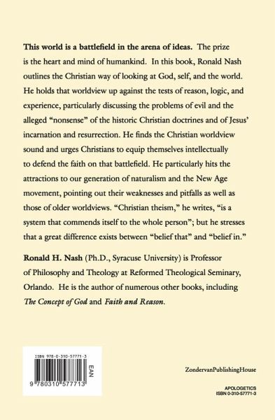 This world is a battlefield in the arena of ideas. The prize is the heart and mind of humankind. In this book, Ronald Nash outlines the Christian way of looking at God, self, and the world. He holds that worldview up against the tests of reason, logic, and experience, particularly discussing the problems of evil and the alleged "nonsense" of the historic Christian doctrines and of Jesus' incarnation and resurrection. He finds the Christian worldview sound and urges Christians to equip themselves intellectually to defend the faith on that battlefield. He particularly hits the attractions to our generation of naturalism and the New Age movement, pointing out their weaknesses and pitfalls as well as those of older worldviews. "Christian theism," he writes, "is a system that commends itself to the whole person"; but he stresses that a great difference exists between "belief that" and "belief in."