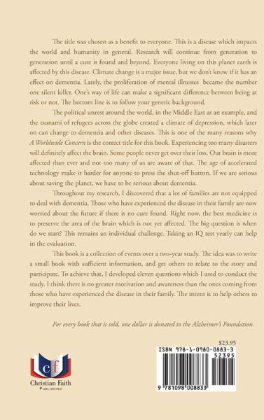 The title was chosen as a benefit to everyone. This is a disease which impacts the world and humanity in general. Research will continue from generation to generation until a cure is found and beyond. Everyone living on this planet earth is affected by this disease. Climate change is a major issue, but we don’t know if it has an effect on dementia. Lately, the proliferation of mental illnesses became the number one silent killer. One’s way of life can make a significant difference between being at risk or not. The bottom line is to follow your genetic background. The political unrest around the world, in the Middle East as an example, and the tsunami of refugees across the globe created a climate of depression, which later on can change to dementia and other diseases. This is one of the many reasons why A Worldwide Concern is the correct title for this book. Experiencing too many disasters will definitely affect the brain. Some people never get over their loss. Our brain is more affected than ever and not too many of us are aware of that. The age of accelerated technology make it harder for anyone to press the shut-off button. If we are serious about saving the planet, we have to be serious about dementia. Throughout my research, I discovered that a lot of families are not equipped to deal with dementia. Those who have experienced the disease in their family are now worried about the future if there is no cure found. Right now, the best medicine is to preserve the area of the brain which is not yet affected. The big question is when do we start? This remains an individual challenge. Taking an IQ test yearly can help in the evaluation. This book is a collection of events over a two-year study. The idea was to write a small book with sufficient information, and get others to relate to the story and participate. To achieve that, I developed eleven questions which I used to conduct the study. I think there is no greater motivation and awareness than the ones coming from those who have experienced the disease in their family. The intent is to help others to improve their lives. For every book that is sold, one dollar is donated to the Alzheimer's Foundation.