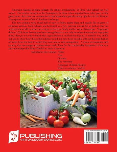 American regional cooking reflects the ethnic contributions of those who settled our vast nation. The recipes brought to this hemisphere by those who emigrated from other parts of the globe more often than not contain foods that began their global journey right here in the Western Hemisphere as part of the Columbian Exchange. This two-volume work, chuck full of easy-to-follow recipe ideas and equally full of gems of collected wisdom, both culinary and historical, is a very personal journal by an author who has searched the world to ferret out recipes to feed her family and her own adventurism. Vegetarian dishes (1,528) from 164 nations have been gathered to not only introduce international vegetarian menu ideas; to not only confirm that vegetarianism is much more than just a meatless way of life; but also to show how these ethnic dishes would not have been possible without the introduction of foods from the land to which they now return with immigration. A menu accompanies each country that encourages experimentation and allows for the comfortable integration of the new and interesting with dishes familiar to most Americans. Included in this volume: Africa Asia Oceania The Americas Appendix of Basic Recipes Index to volumes I and II