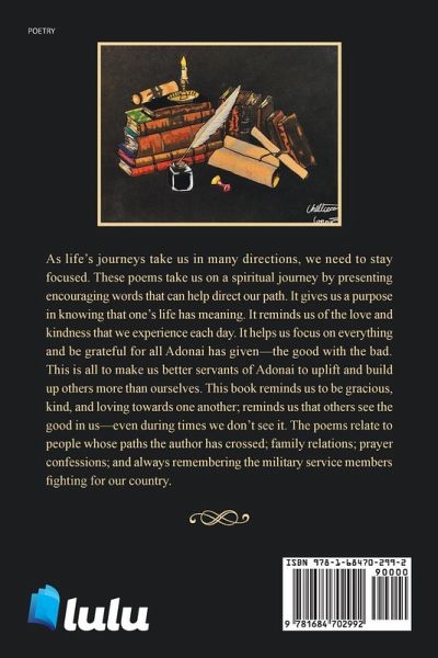 As life's journeys take us in many directions, we need to stay focused. These poems take us on a spiritual journey by presenting encouraging words that can help direct our path. It gives us a purpose in knowing that one's life has meaning. It reminds us of the love and kindness that we experience each day. It helps us focus on everything and be grateful for all Adonai has given-the good with the bad. This is all to make us better servants of Adonai to uplift and build up others more than ourselves. This book reminds us to be gracious, kind, and loving towards one another; reminds us that others see the good in us-even during times we don't see it. The poems relate to people whose paths the author has crossed; family relations; prayer confessions; and always remembering the military service members fighting for our country.