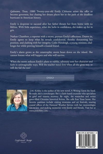 Galveston, Texas, 1900: Twenty-year-old Emily Cleburne seizes the offer to become governess, but chasing her dream places her in the path of the deadliest hurricane in American history. Emily is desperate to succeed after her father thrusts her from home with no lifeline. With little experience, what she lacks in confidence, she makes up for in grit. Nathan Chambers, a reporter with a secret, pursues Emily's affections. Drawn in, Emily agrees to keep what he reveals confidential, thereby threatening her position, and clashing with her integrity. Colin Hensleigh, a young minister, challenges her while proving himself a trusted friend. Emily's alarm grows as the catastrophic storm bears down on the island. She cannot foresee what will happen and who will survive. When the storm reduces Emily's plans to rubble, adversity tests her character and faith in unimaginable ways. Will the teacher stand firm when all else gives way, or will she fail the test? ~ Grief themes ~ Includes book club discussion questions