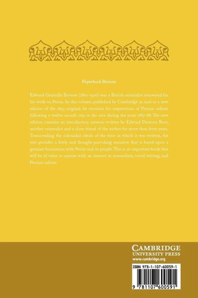 Edward Granville Browne (1862-1926) was a British orientalist renowned for his work on Persia. In this volume, published by Cambridge in 1926 as a new edition of the 1893 original, he recounts his impressions of Persian culture following a twelve-month stay in the area during the years 1887-8. The new edition contains an introductory memoir written by Edward Denison Ross, another orientalist and a close friend of the author for more than forty years. Transcending the colonialist ideals of the time in which it was written, the text provides a lively and thought-provoking narrative that is based upon a genuine fascination with Persia and its people. This is an important book that will be of value to anyone with an interest in orientalism, travel writing, and Persian culture.