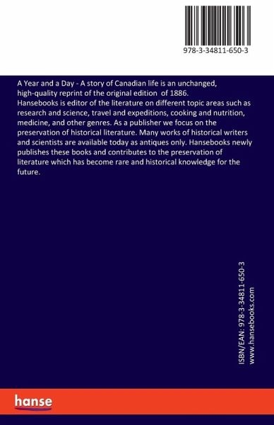 A Year and a Day - A story of Canadian life is an unchanged, high-quality reprint of the original edition of 1886.Hansebooks is editor of the literature on different topic areas such as research and science, travel and expeditions, cooking and nutrition, medicine, and other genres. As a publisher we focus on the preservation of historical literature. Many works of historical writers and scientists are available today as antiques only. Hansebooks newly publishes these books and contributes to the preservation of literature which has become rare and historical knowledge for the future.