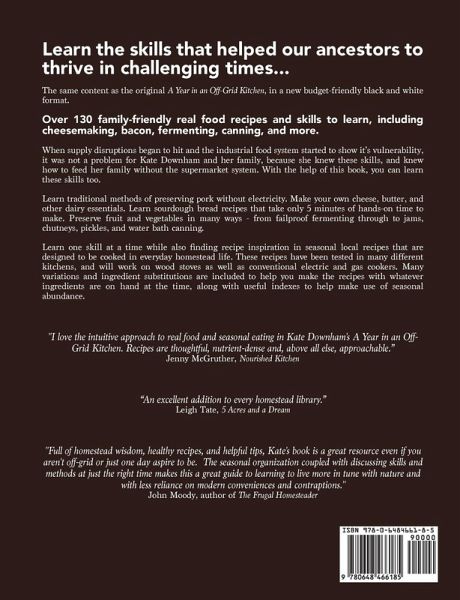 Learn the skills that helped our ancestors to thrive in challenging times... ¿¿¿The same content as the original A Year in an Off-Grid Kitchen, in a new budget-friendly black and white format. Over 130 family-friendly real food recipes and skills to learn, including cheesemaking, bacon, fermenting, canning, and more. When supply disruptions began to hit and the industrial food system started to show it's vulnerability, it was not a problem for Kate Downham and her family, because she knew these skills, and knew how to feed her family without the supermarket system. With the help of this book, you can learn these skills too. Learn traditional methods of preserving pork without electricity. Make your own cheese, butter, and other dairy essentials. Learn sourdough bread recipes that take only 5 minutes of hands-on time to make. Preserve fruit and vegetables in many ways - from failproof fermenting through to jams, chutneys, pickles, and water bath canning. Learn one skill at a time while also finding recipe inspiration in seasonal local recipes that are designed to be cooked in everyday homestead life. These recipes have been tested in many different kitchens, and will work on wood stoves as well as conventional electric and gas cookers. Many variations and ingredient substitutions are included to help you make the recipes with whatever ingredients are on hand at the time, along with useful indexes to help make use of seasonal abundance. "I love the intuitive approach to real food and seasonal eating in Kate Downham's A Year in an Off-Grid Kitchen. Recipes are thoughtful, nutrient-dense and, above all else, approachable." Jenny McGruther, Nourished Kitchen "An excellent addition to every homestead library." Leigh Tate, 5 Acres and a Dream "Full of homestead wisdom, healthy recipes, and helpful tips, Kate's book is a great resource even if you aren't off-grid or just one day aspire to be. The seasonal organization coupled with discussing skills and methods at just the right time makes this a great guide to learning to live more in tune with nature and with less reliance on modern conveniences and contraptions." John Moody, author of The Frugal Homesteader