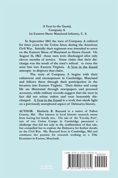 The men of Company A, 1st Eastern Shore Maryland Infantry, U.S. enlisted for three years in the Union Army during the American Civil War. They were discharged the following year after only eleven months of service. "A Year in the Guard" sheds light on a neglected aspect of Delmarva Maryland history by following the men of Company A from their enlistment and encampment in Cambridge, MD through their participation in the invasion into Eastern Virginia. Their duties and camp life are illustrated by newspapers and personal accounts. Special attention is focused on their discharge, disputing previous claims that they refused orders. A brief biographical summary is included for each soldier in the Company.