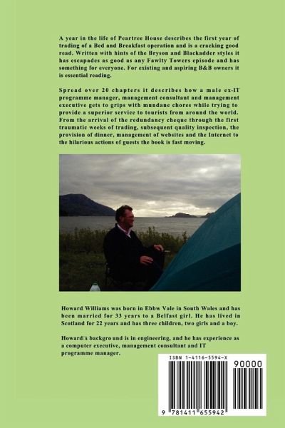 A year in the life of Peartree House Bed & Breakfast describes the first year of trading of a Bed and Breakfast guest house operation in Scotland and is a cracking good read. Written with hints of the Bryson and Blackadder styles it has escapades as good as any Fawlty Towers episode and has something for everyone. For existing and aspiring B&B owners it is essential reading. Spread over 20 chapters it describes how a male ex-IT programme manager, management consultant and management executive gets to grips with mundane chores while trying to provide a superior service to tourists from around the world. From the arrival of the redundancy cheque through the first traumatic weeks of trading, subsequent quality inspection, the provision of dinner, management of websites and the Internet to the hilarious actions of guests the book is fast moving.