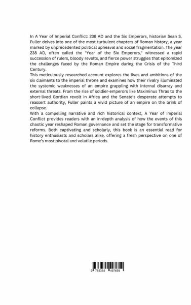 In A Year of Imperial Conflict: 238 AD and the Six Emperors, historian Sean S. Fuller delves into one of the most turbulent chapters of Roman history, a year marked by unprecedented political upheaval and social fragmentation. The year 238 AD, often called the "Year of the Six Emperors," witnessed a rapid succession of rulers, bloody revolts, and fierce power struggles that epitomized the challenges faced by the Roman Empire during the Crisis of the Third Century.This meticulously researched account explores the lives and ambitions of the six claimants to the imperial throne and examines how their rivalry illuminated the systemic weaknesses of an empire grappling with internal disarray and external threats. From the rise of soldier-emperors like Maximinus Thrax to the short-lived Gordian revolt in Africa and the Senate's desperate attempts to reassert authority, Fuller paints a vivid picture of an empire on the brink of collapse.With a compelling narrative and rich historical context, A Year of Imperial Conflict provides readers with an in-depth analysis of how the events of this chaotic year reshaped Roman governance and set the stage for transformative reforms. Both captivating and scholarly, this book is an essential read for history enthusiasts and scholars alike, offering a fresh perspective on one of Rome's most pivotal and volatile periods.