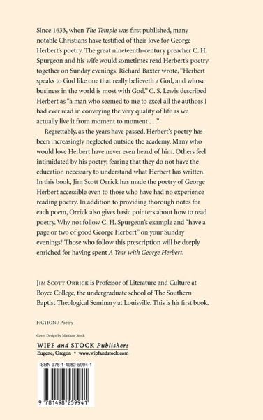 Since 1633, when The Temple was first published, many notable Christians have testified of their love for George Herbert's poetry. The great nineteenth-century preacher C. H. Spurgeon and his wife would sometimes read Herbert's poetry together on Sunday evenings. Richard Baxter wrote, ""Herbert speaks to God like one that really believeth a God, and whose business in the world is most with God."" C. S. Lewis described Herbert as ""a man who seemed to me to excel all the authors I had ever read in conveying the very quality of life as we actually live it from moment to moment . . ."" Regrettably, as the years have passed, Herbert's poetry has been increasingly neglected outside the academy. Many who would love Herbert have never even heard of him. Others feel intimidated by his poetry, fearing that they do not have the education necessary to understand what Herbert has written. In this book, Jimmy Scott Orrick has made the poetry of George Herbert accessible even to those who have had no experience reading poetry. In addition to providing thorough notes for each poem, Orrick also gives basic pointers about how to read poetry. Why not follow C. H. Spurgeon's example and ""have a page or two of good George Herbert"" on your Sunday evenings? Those who follow this prescription will be deeply enriched for having spent A Year with George Herbert.