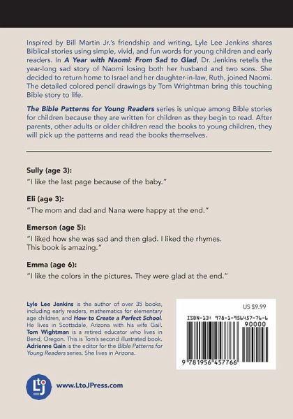 Inspired by Bill Martin Jr.'s friendship and writing, Lyle Lee Jenkins shares Biblical stories using simple, vivid, and fun words for young children and early readers. In A Year with Naomi: From Sad to Glad, Dr. Jenkins retells the year-long sad story of Naomi losing both her husband and two sons. She decided to return home to Israel and her daughter-in-law, Ruth, joined Naomi. The detailed colored pencil drawings by Tom Wrightman bring this touching Bible story to life. The Bible Patterns for Young Readers series is unique among Bible stories for children because they are written for children as they begin to read. After parents, other adults or older children read the books to young children, they will pick up the patterns and read the books themselves.