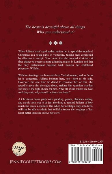 The heart is deceitful above all things. Who can understand it? When Juliana Issot's godmother invites her to spend the month of Christmas at a house party in Yorkshire, Juliana feels compelled by affection to accept. Never mind that she escaped Yorkshire at the first chance to secure a more glittering match in London and that the only matrimonial prospect back home is her childhood playmate, Willelm. Willelm Armitage is a born-and-bred Yorkshireman, and as far as he is concerned, Juliana belongs here, too - here at his side. However, the one time he dared to convince her of this, she speedily gave him the right-about, making him question whether she truly is the right choice for him. After all, if she cannot see how well they suit, why should he force her hand? A Christmas house party with pudding, games, charades, riding, and carols turns out to be just the thing to remind Juliana of how much she loves Yorkshire. But when her nostalgia slips into love, will she be able to admit that Willelm knows the longings of her heart better than she knows her own?