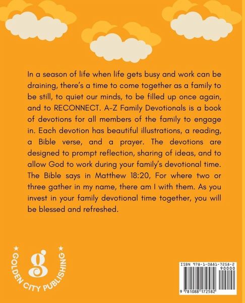 In a season of life when life gets busy and work can be draining, there's a time to come together as a family to be still, to quiet our minds, to be filled up once again, and to RECONNECT. A-Z Family Devotionals is a book of devotions for all members of the family to engage in. Each devotion has beautiful illustrations, a reading, a Bible verse, and a prayer. The devotions are designed to prompt reflection, sharing of ideas, and to allow God to work during your family's devotional time. The Bible says in Matthew 18:20, For where two or three gather in my name, there am I with them. As you invest in your family devotional time together, you will be blessed and refreshed.