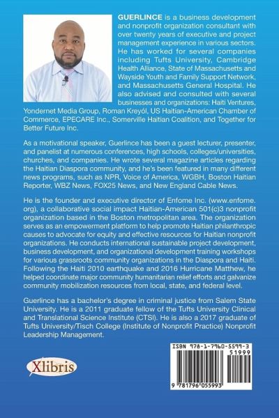 AUTHOR'S BIOGRAPHY Guerlince is a business development and nonprofit organization consultant with over twenty years of executive and project management experience in various sectors. He has worked for several companies including Tufts University, Cambridge Health Alliance, State of Massachusetts and Wayside Youth and Family Support Network, and Massachusetts General Hospital. He also advised and consulted with several businesses and organizations: Haiti Ventures, Yondernet Media Group, Roman Kreyól, US Haitian-American Chamber of Commerce, EPECARE Inc., Somerville Haitian Coalition, and Together for Better Future Inc. As a motivational speaker, Guerlince has been a guest lecturer, presenter, and panelist at numerous conferences, high schools, colleges/universities, churches, and companies. He wrote several magazine articles regarding the Haitian Diaspora community, and he's been featured in many different news programs, such as NPR, Voice of America, WGBH, Boston Haitian Reporter, WBZ News, FOX25 News, and New England Cable News. He is the founder and executive director of Enfome Inc. (www.enfome.org), a collaborative social impact Haitian-American 501(c)3 nonprofit organization based in the Boston metropolitan area. The organization serves as an empowerment platform to help promote Haitian philanthropic causes to advocate for equity and effective resources for Haitian nonprofit organizations. He conducts international sustainable project development, business development, and organizational development training workshops for various grassroots community organizations in the Diaspora and Haiti. Following the Haiti 2010 earthquake and 2016 Hurricane Matthew, he helped coordinate major community humanitarian relief efforts and galvanize community mobilization resources from local, state, and federal level. Guerlince has a bachelor's degree in criminal justice from Salem State University. He is a 2011 graduate fellow of the Tufts University Clinical and Translational Science Institute (CTSI). He is also a 2017 graduate of Tufts University/Tisch College (Institute of Nonprofit Practice) Nonprofit Leadership Management.